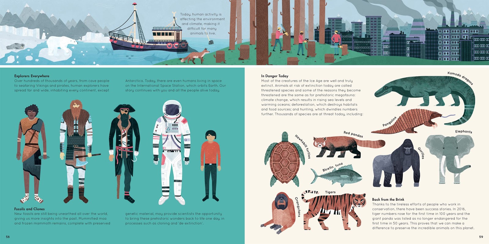 人類的早期親戚大約出現在更新世初期,跟這本書裡的史前動物一起生活。雖然當時的生活條件很困難,他們還是適應了環境、存活下來,逐漸演化並擴散開來。1萬5千年前左右,最後幾條冰河開始融化,人們因此能夠挺進原本天寒地凍的遙遠北方。